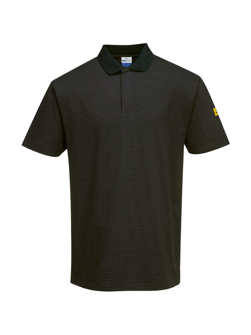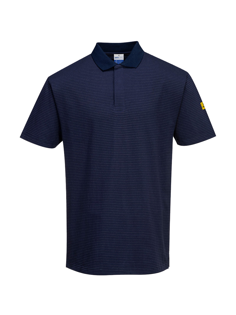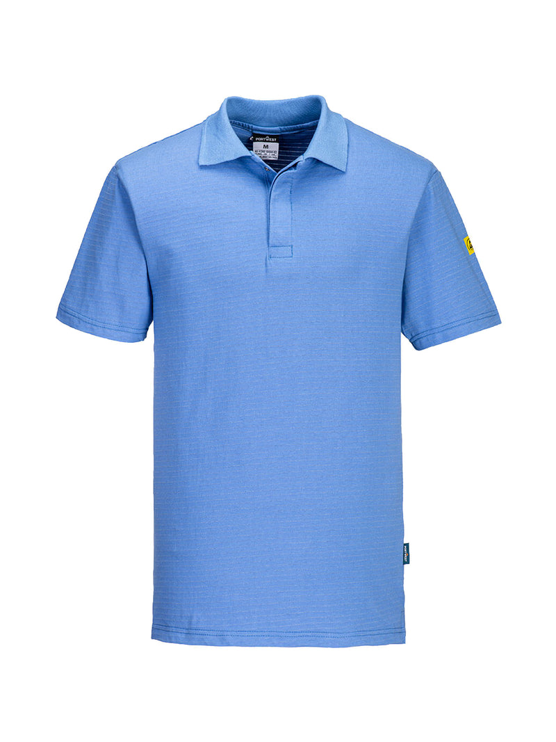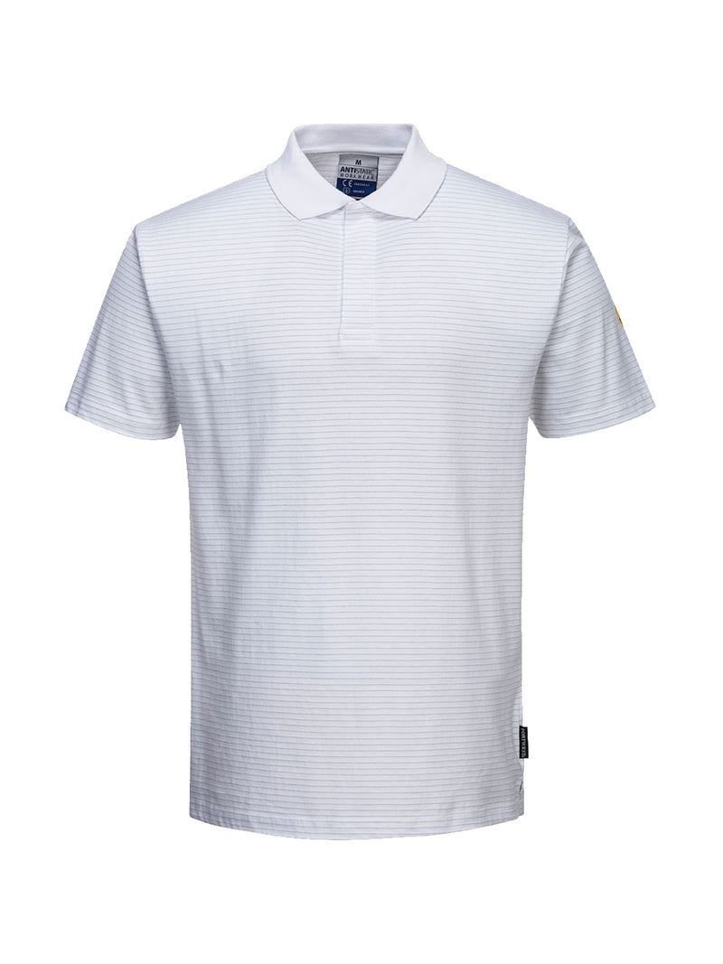 AccediPolo in cotone con protezione necessaria in ambienti ESD. Facile apertura frontale con bottoni, colletto a costine e design antigraffio senza parti metalliche esposte.