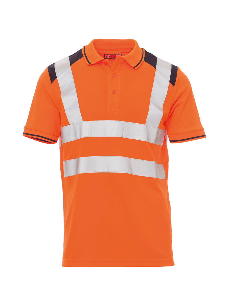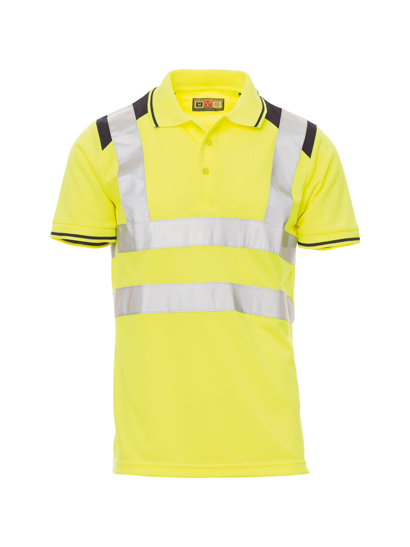 AccediPolo bicolore da uomo a manica corta in alta visibilità con bande riflettenti, con 3 bottoni in tinta effetto perlato, collo e bordo manica con fine profilo a contrasto, colletto e bordo manica a costine, spacchetti laterali, cuciture del collo coperte.