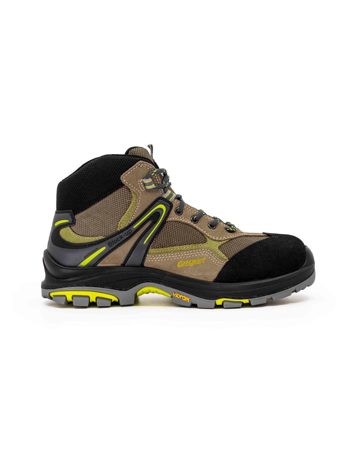 Scarponcino di sicurezza progettato per garantire sicurezza e comfort, con tomaia in vera pelle scamosciata beige di prima qualità e Cordura. La nuova tecnologia costruttiva, che include la suola e il puntale traspirante in acciaio traforato, unisce sportività e leggerezza senza compromettere la protezione. Caratteristiche principali: Block-Up System per il bloccaggio del tallone e un perfetto controllo del piede, suola Vibram antiscivolo, fodera traspirante in AT 488 3D Airmesh, allacciatura rapida, puntale protettivo, sistema antitorsione e lamina non metallica. Peso 650 g (misura 41). Certificato EN ISO 20345:2011.