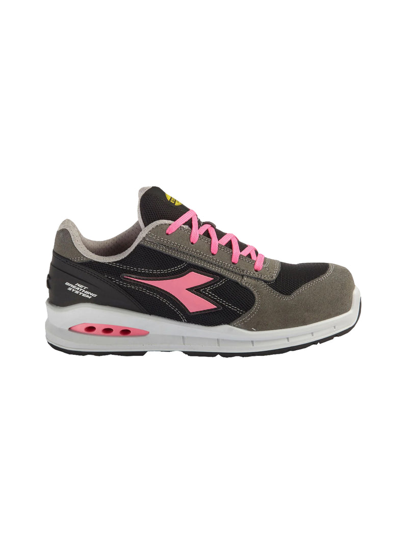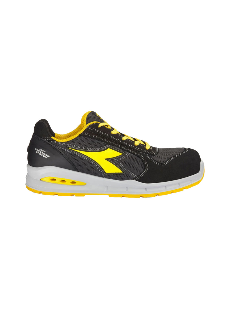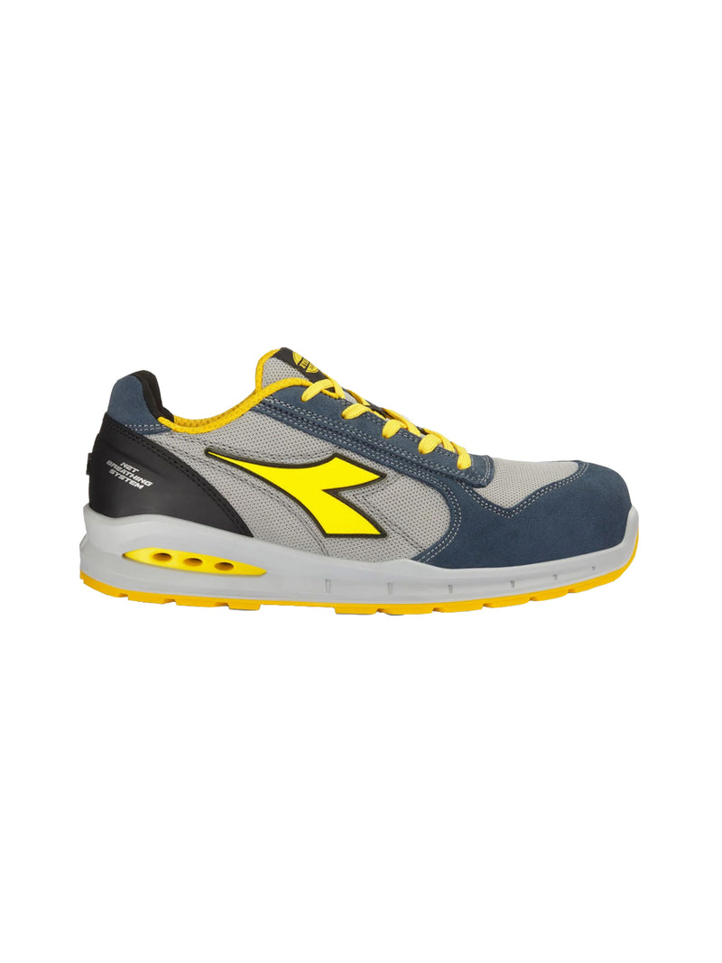 Calzatura di sicurezza bassa S1PS in pelle bovina scamosciata e tessuto poliestere. Supporto ergonomico del tallone in TPU. Puntale in alluminio 200J. Inserto antiperforazione K-SOLE. Calzata 11. Tecnologia Net Breathing System by Geox con sistema di traspirazione laterale. Fodera in in Air Mesh con antiscalzante in microfibra. Plantare estraibile microforato in PU espanso a celle aperte, traspirante con carboni attivi.