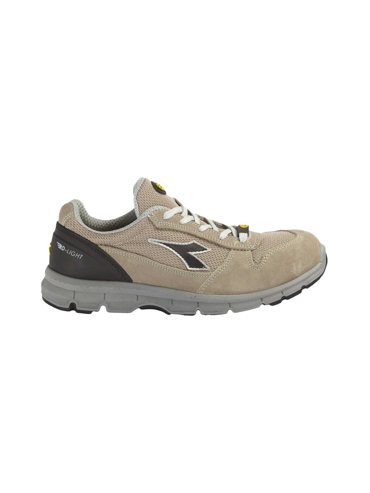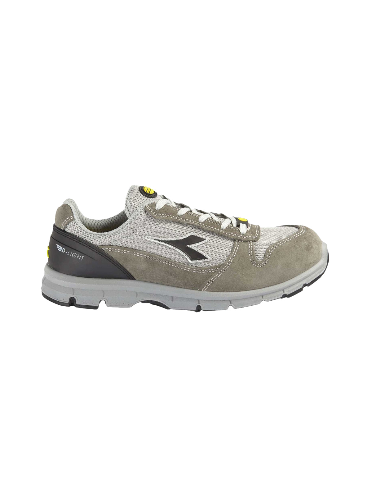 Calzatura di sicurezza bassa S1PS in pelle bovina scamosciata e tessuto poliestere. Supporto ergonomico del tallone in TPU. Puntale in acciaio 200J. Inserto antiperforazione K-SOLE. Calzata 10. Tecnologia D-Light. Fodera in Air Mesh. Plantare anatomico microforato, antistatico estraibile in PU espanso riciclato a celle aperte, traspirante con carboni attivi. ESD.