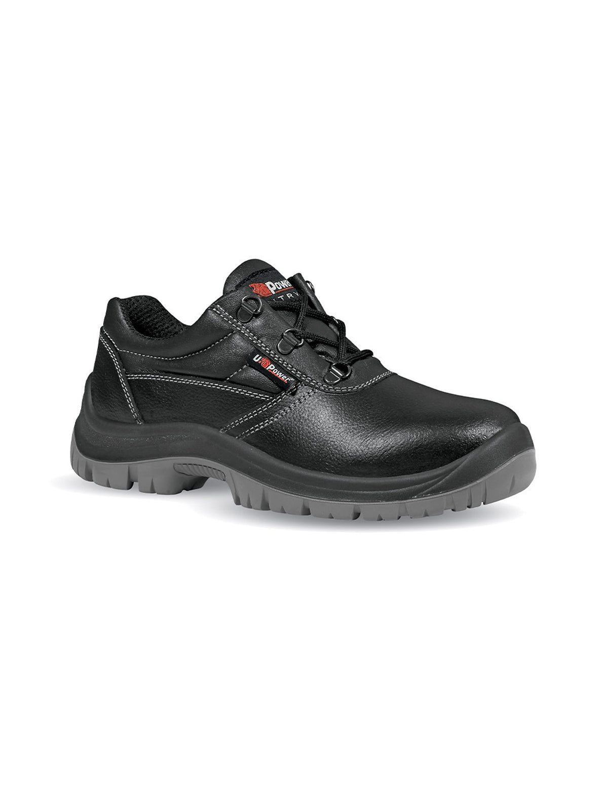 Scarpe antinfortunistiche basse sicure della linea Entry U Power, con tomaia in pelle stampata, idrorepellente, puntale in acciaio, antiperforazione, antiscivolo, lamina in acciaio ergonomica e suola PU/PU.
