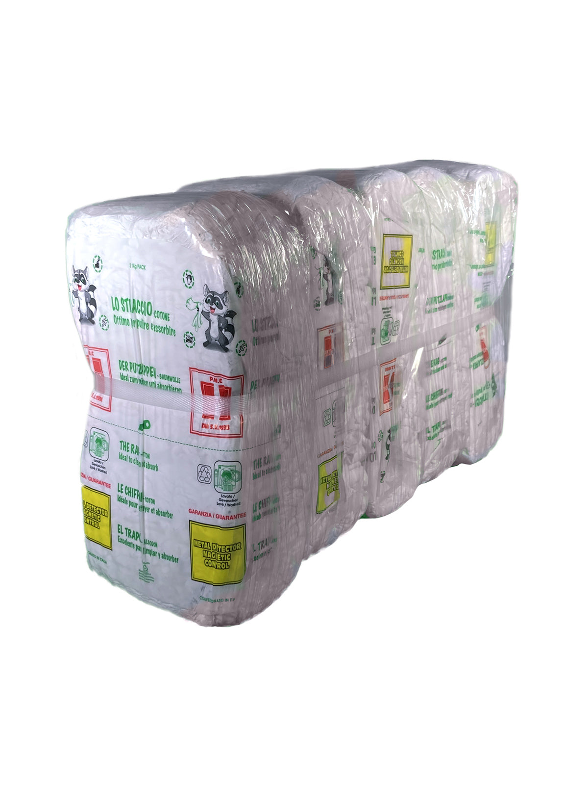 Stracci in cotone bianco, realizzati in tessuto di lenzuola di alta qualità, ideali per una varietà di settori. Grazie alla loro alta capacità di assorbenza e spessore sottile, sono perfetti per lavori di pulizia e manutenzione. Ogni confezione contiene 5 pacchi da 2 kg, per un totale di 10 kg di stracci.