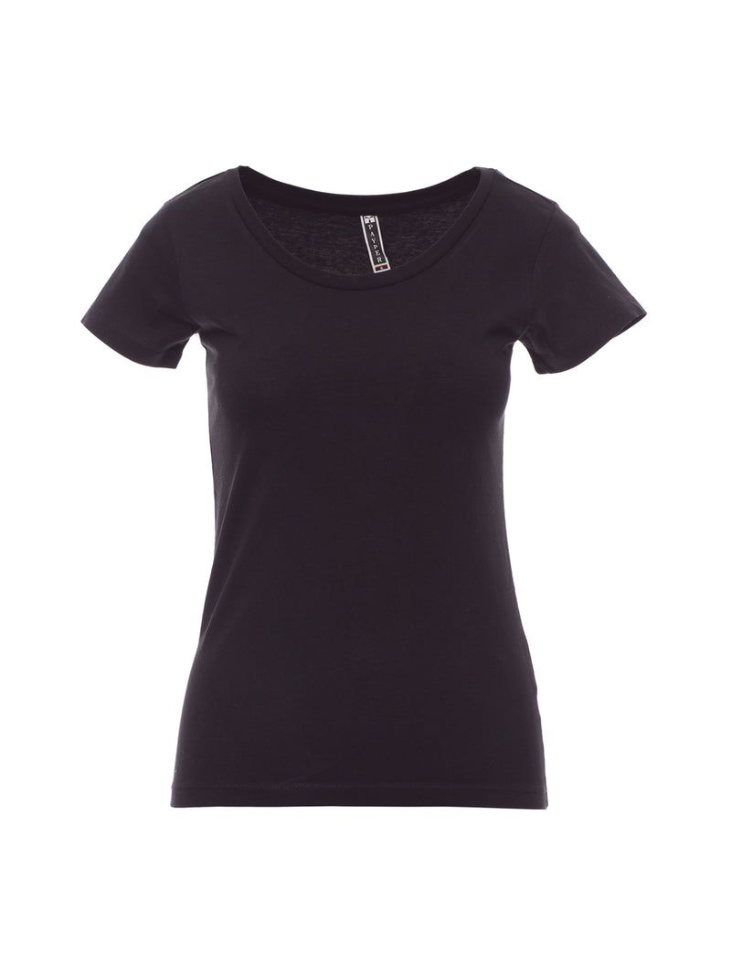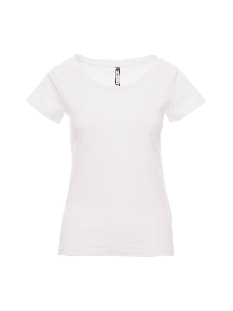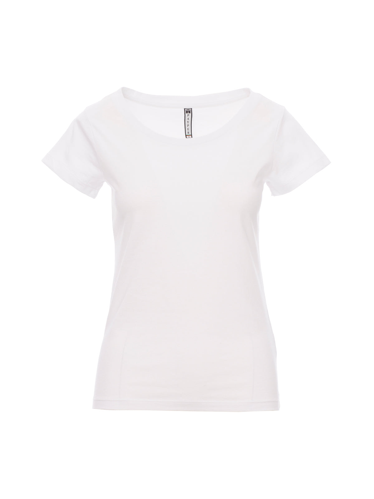 T-shirt manica corta sfiancata da donna con girocollo ampio, basso misto spandex da 1.2 cm, maniche corte, strette e cucitura laterale per una vestibilità più precisa, cuciture a due aghi su spalle e retro collo e nastratura in cotone.