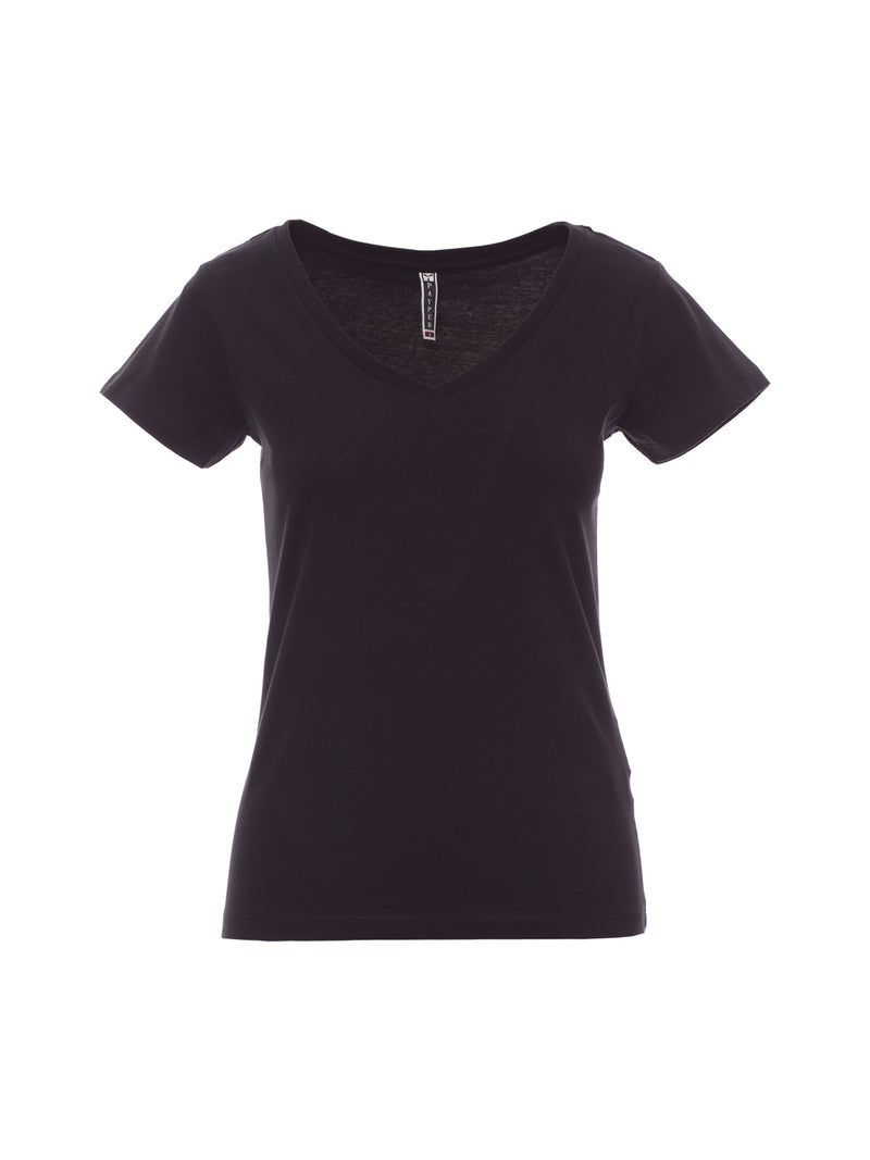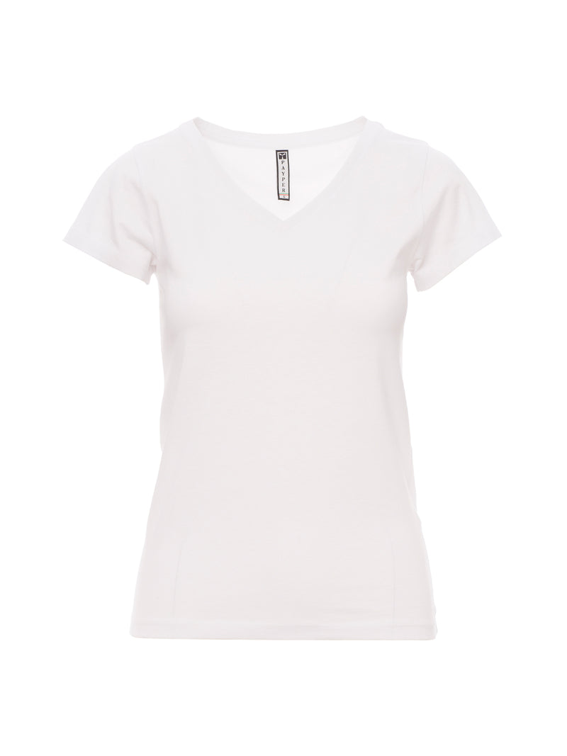 T-shirt manica corta sfiancata da donna con collo a V ampio, basso misto spandex da 1.2 cm, maniche corte, strette e cucitura laterale per una vestibilità più precisa, cuciture a due aghi su spalle e retro collo e nastratura in cotone.