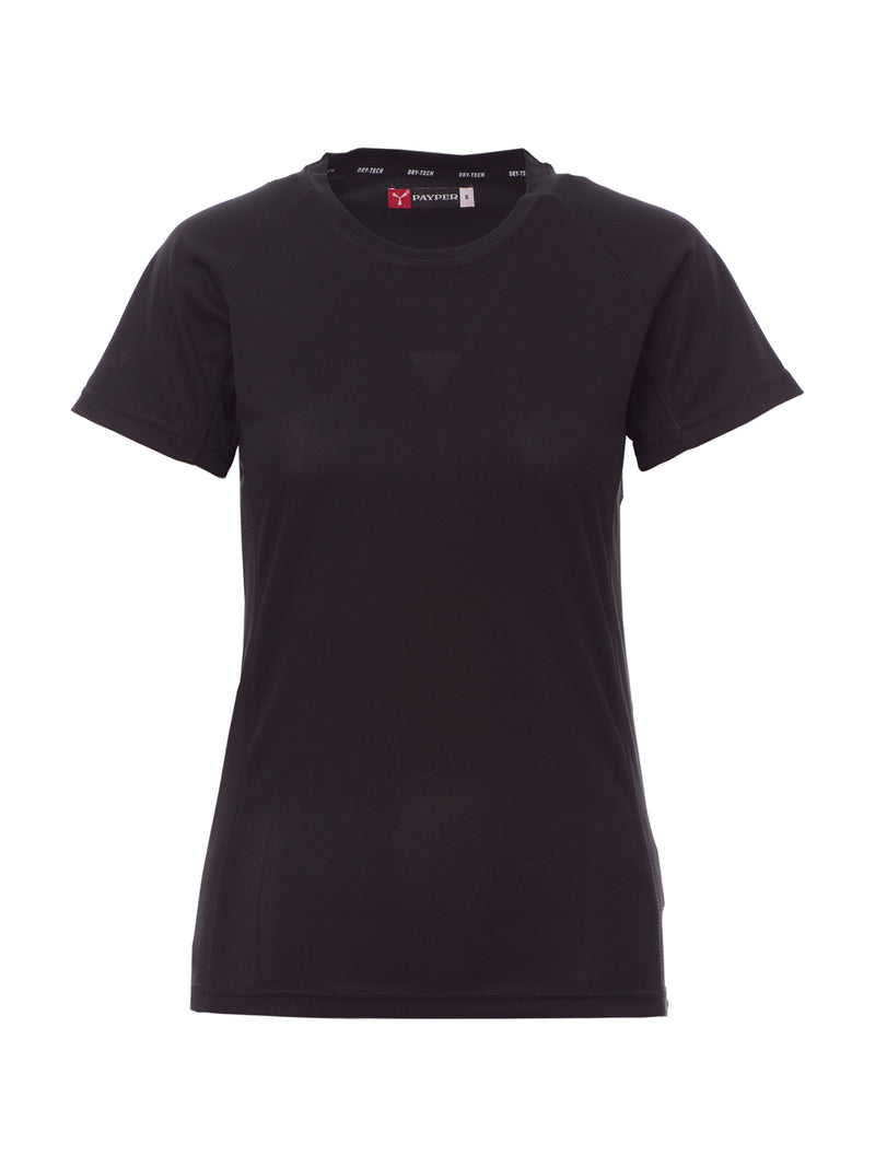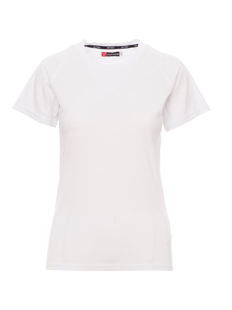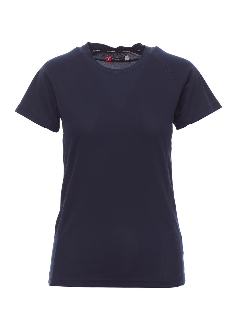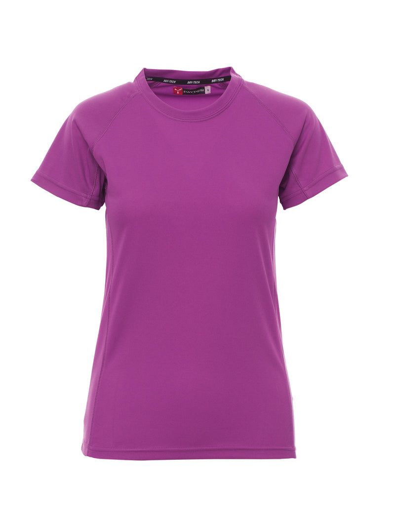 T-shirt tecnica-sportiva da donna, sfiancata, con maniche raglan per maggiore libertà di movimento. Dotata di doppia cucitura laterale per una vestibilità ottimale e nastratura al collo per maggiore comfort. Ideale per attività sportive e uso quotidiano.