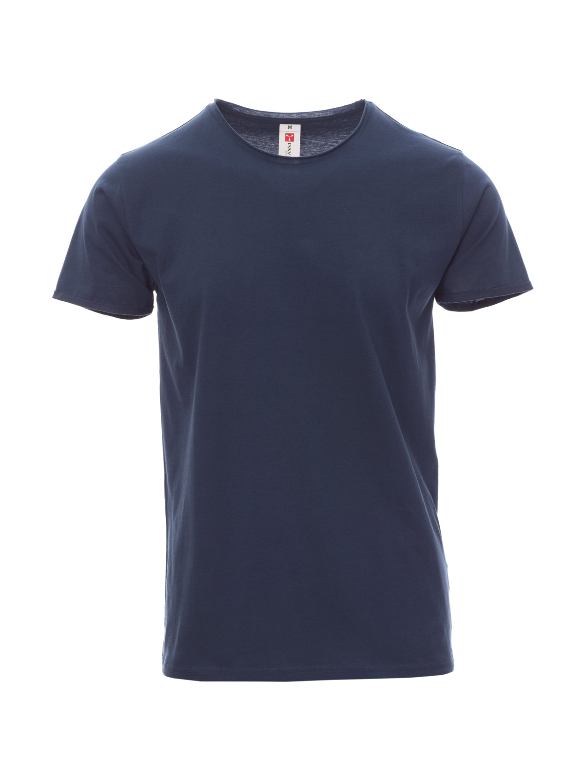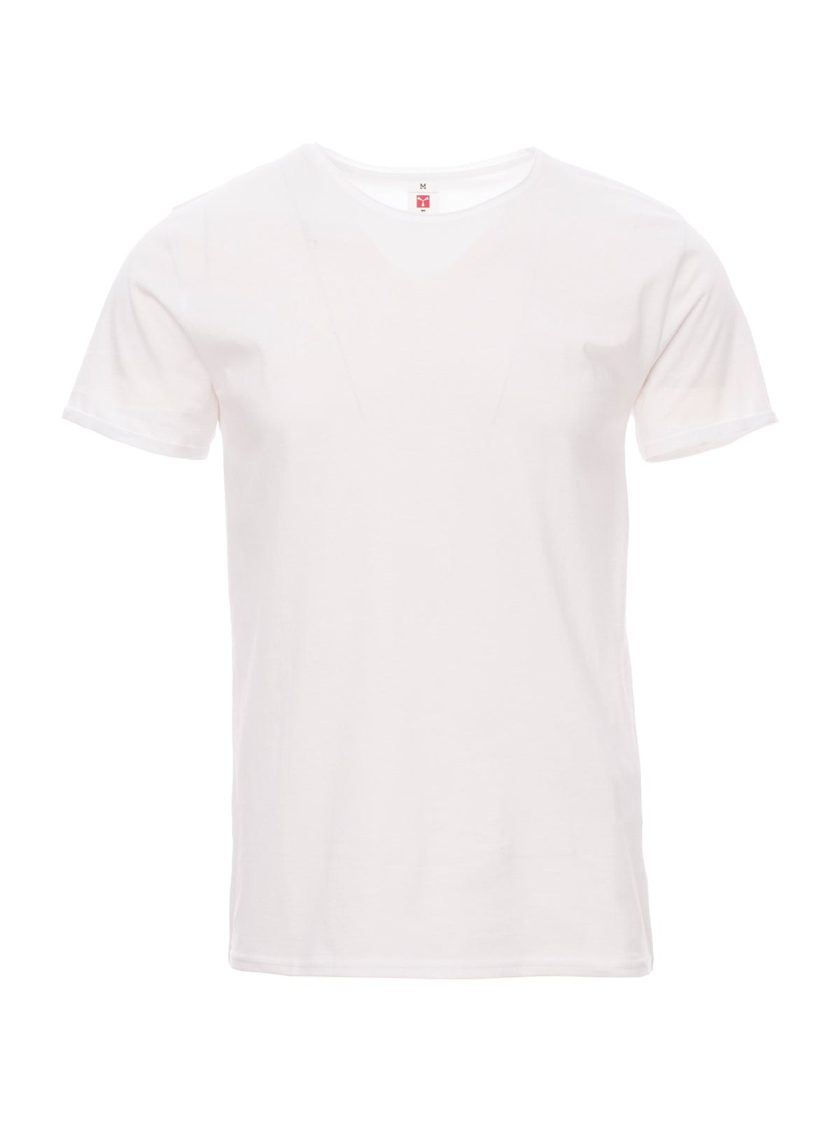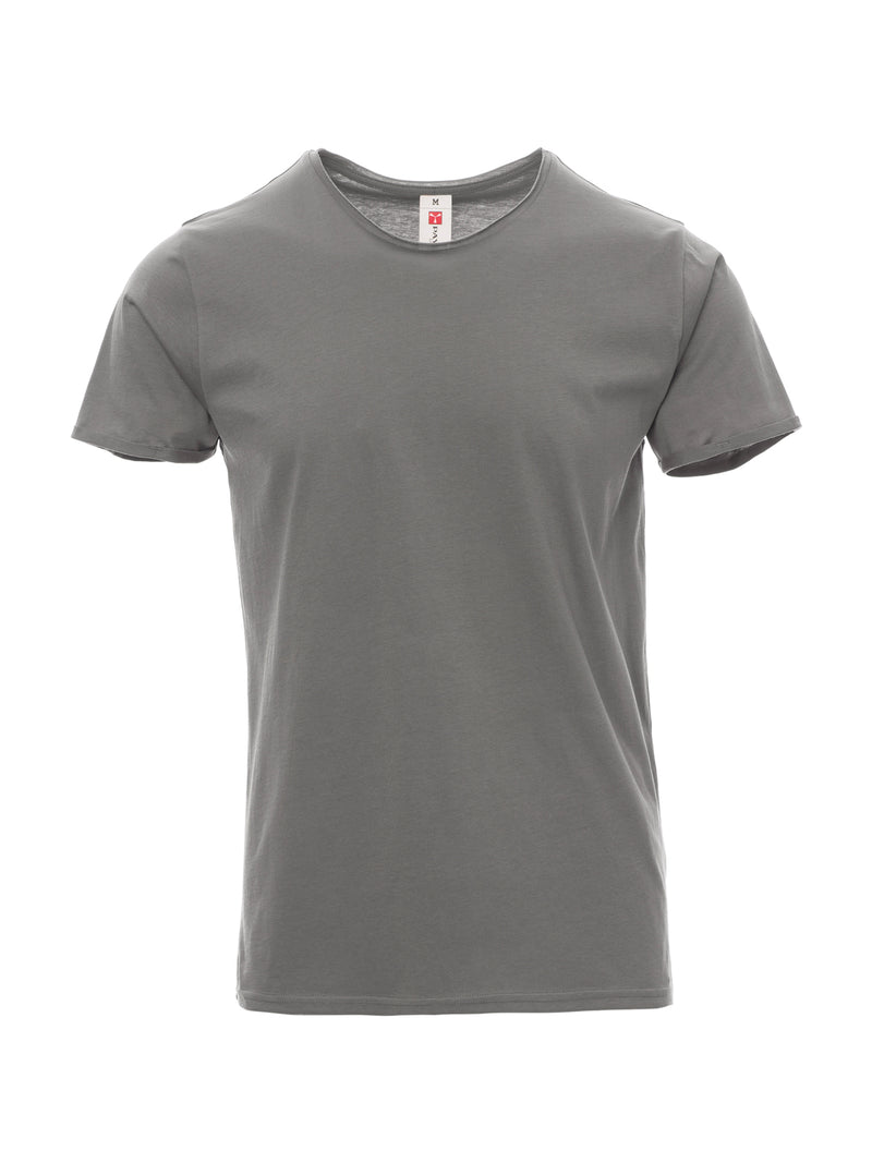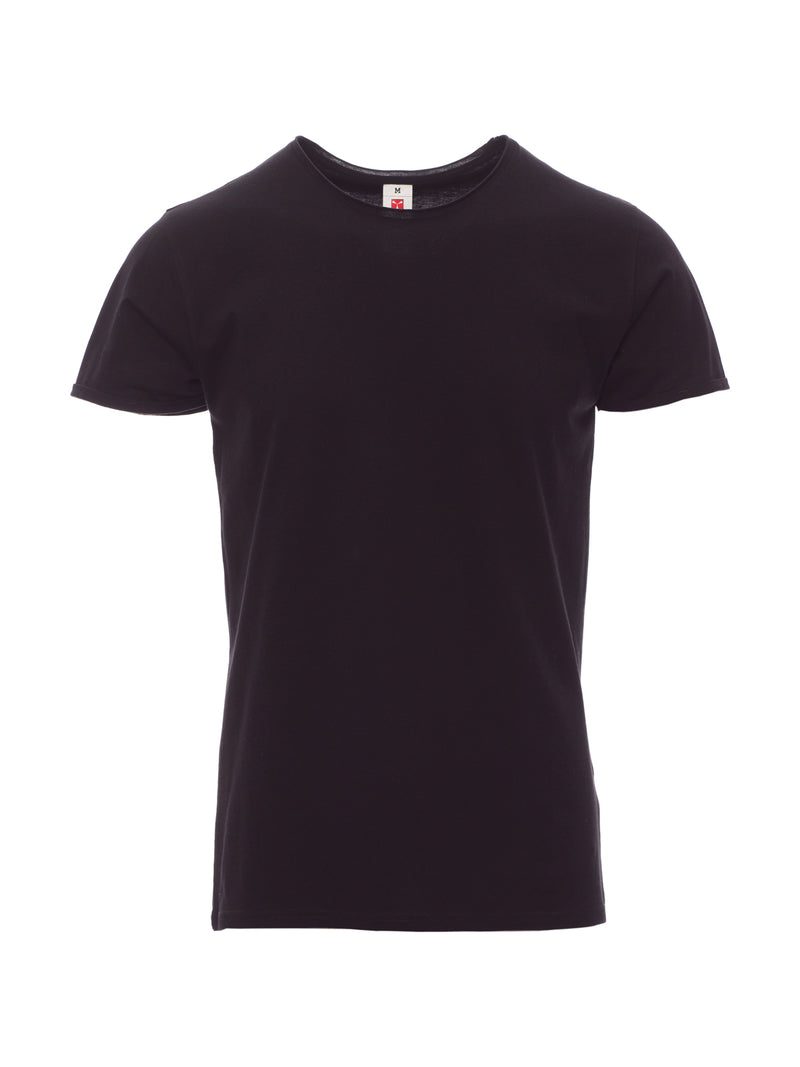 T-shirt manica corta con girocollo leggermente ampio, spalle con doppia cucitura interna, maniche corte a taglio vivo con fine risvolto, cuciture laterali.