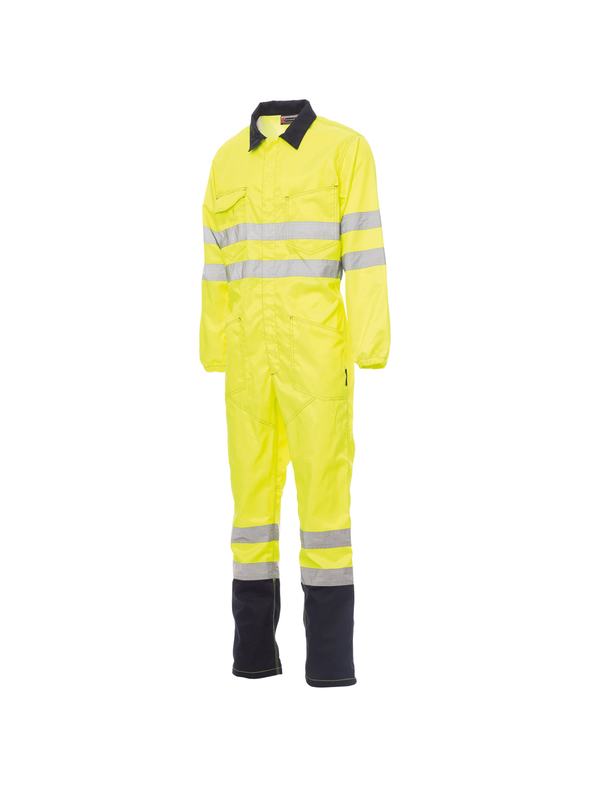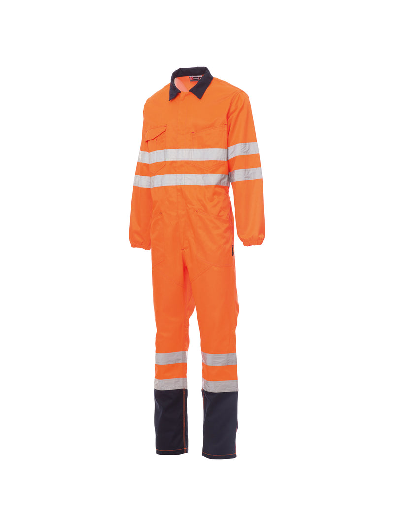 AccediTuta alta visibilità con bande riflettenti, cerniera centrale coperta a doppio cursore,elastico in vita sul retro. Triple cuciture di rinforzo nel cavallo ed interno gamba. Due ampie tasche applicate, due tasche al petto di cui una chiusa con patta e anello di aggancio per porta badge, un portapenne, una tasca posteriore con patta, portametro laterale destro. Polsini con elastici.